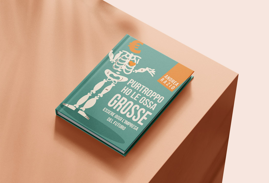 Ed ecco che così si materializza uno scheletro al quale, qua e là, ho ingrossato un po’ le ossa, un cuoricino e il simbolo dell’euro al posto del teschio, entrambi di colore arancione. Il font è lineare e di differenti grandezze, sottolineando alcuni termini piuttosto che altri. Il nome dell’autore entra nella copertina, racchiuso in un rettangolo anch’esso arancione.