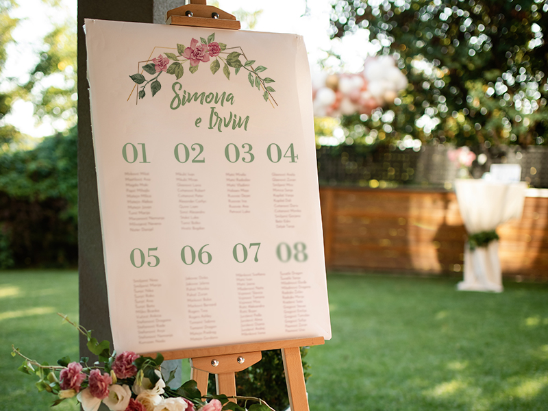 - Segnatavolo, decorato con gli stessi elementi grafici per identificare con eleganza ogni tavolo degli ospiti