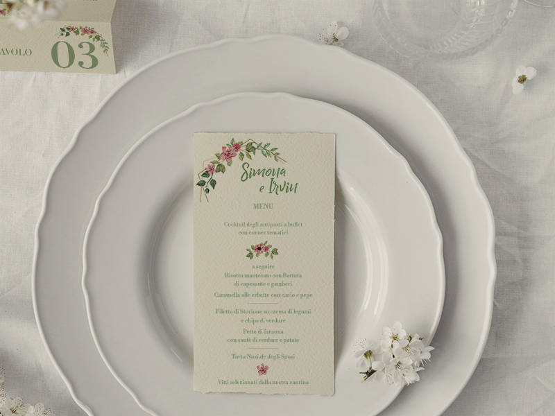 - Menu che riprende il tema floreale per accompagnare il banchetto nuziale