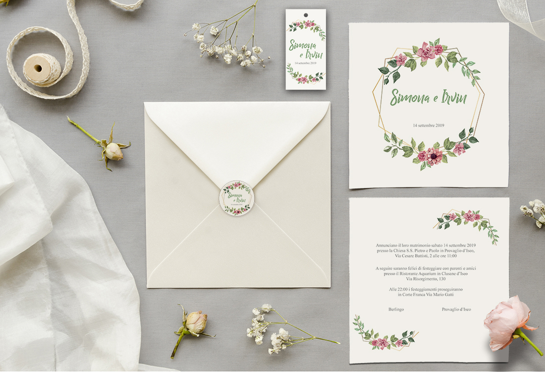 Il design si ispira alla delicatezza della flora mediterranea, con una raffinata ghirlanda di rose e foglie che incornicia i dettagli più importanti di questo giorno speciale.